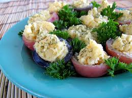 Remove potato halves and Arrange, end side down, on a Platter. Top the each potato half with a small dollop of sour cream, and add your favorite Garnish. 14 Bites.